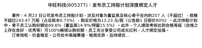 值得注意的是:2024年04月国盛证券的姜文镪分析师,首次发布关于华旺科技的研究报告,标题为:华旺科技(605377):发布员工持股计划深度绑定人才。