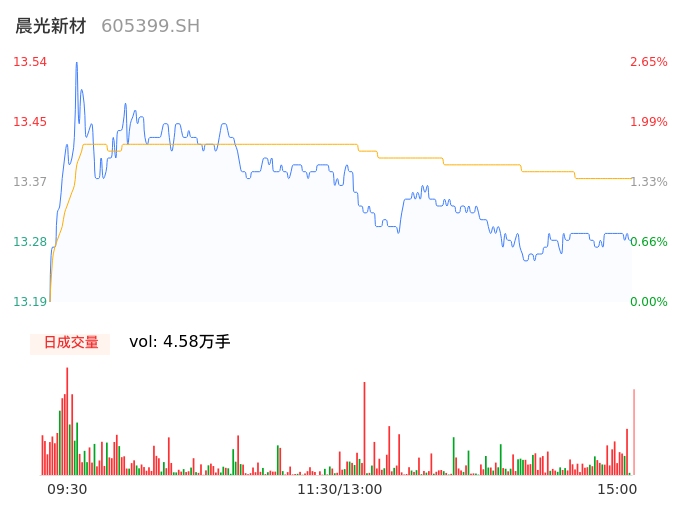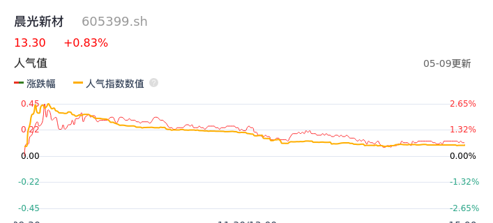 05月09日,晨光新材收报13.30,股价涨幅0.83%,成交金额6114.10万元,换手率1.47%。