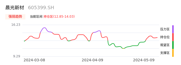 我们来看一下该股的九方特色指标强弱趋势的情况:晨光新材自05月06日从观望区上穿到持仓区。股价近期在多头区域持续强势上扬,上升动能仍较为充足,可积极关注。后续重点关注上方压力位:14.03元是否能突破上攻。
