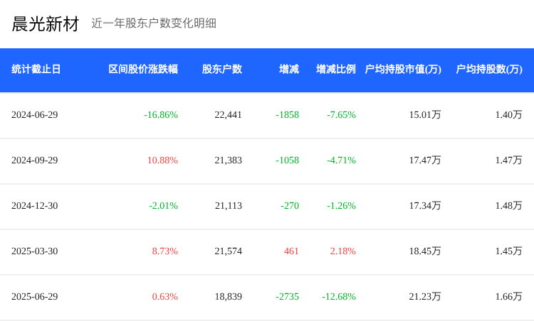 截至2025年6月30日,晨光新材(605399)的股东户数降至18,800户,较上一期减少了12.68%。与此同时,户均持股数量增加至14.35万股,户均持股市值增长至212,300元,分别环比增加15.07%。这表明股东户数减少的同时,单个股东的持股量和市值均有所增加,反映了股东结构的集中化趋势。