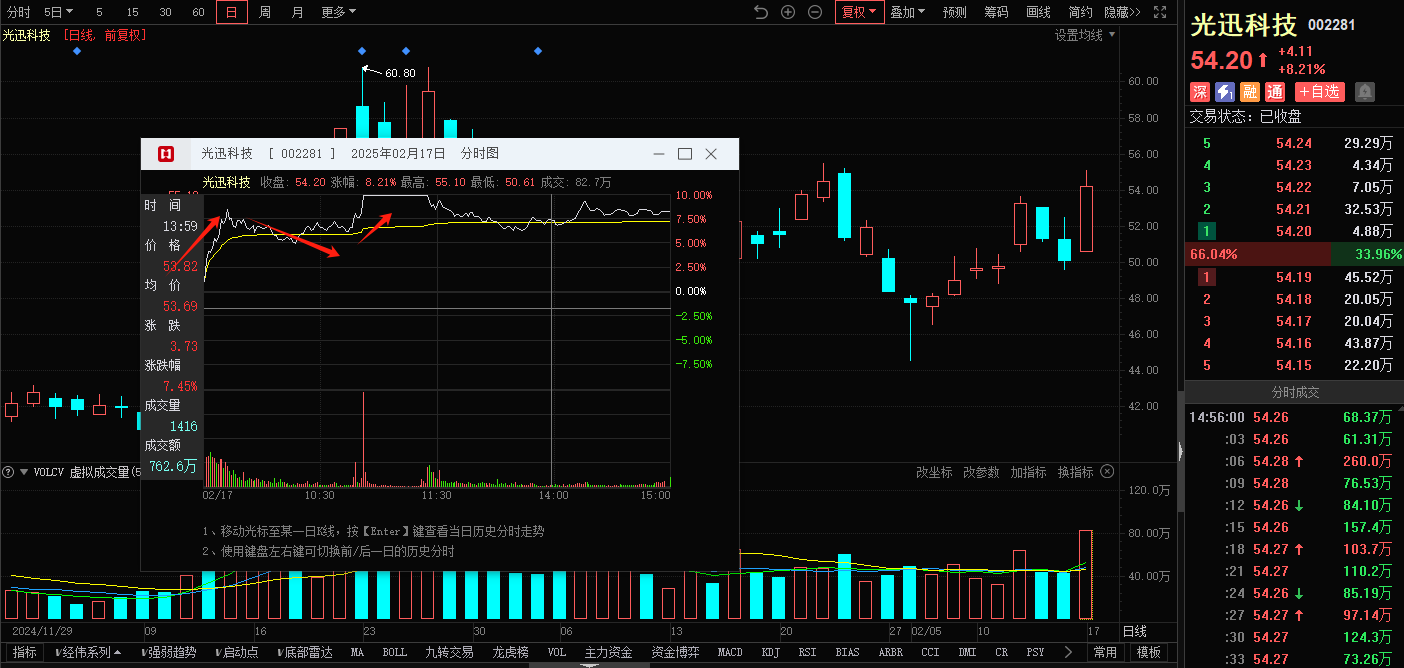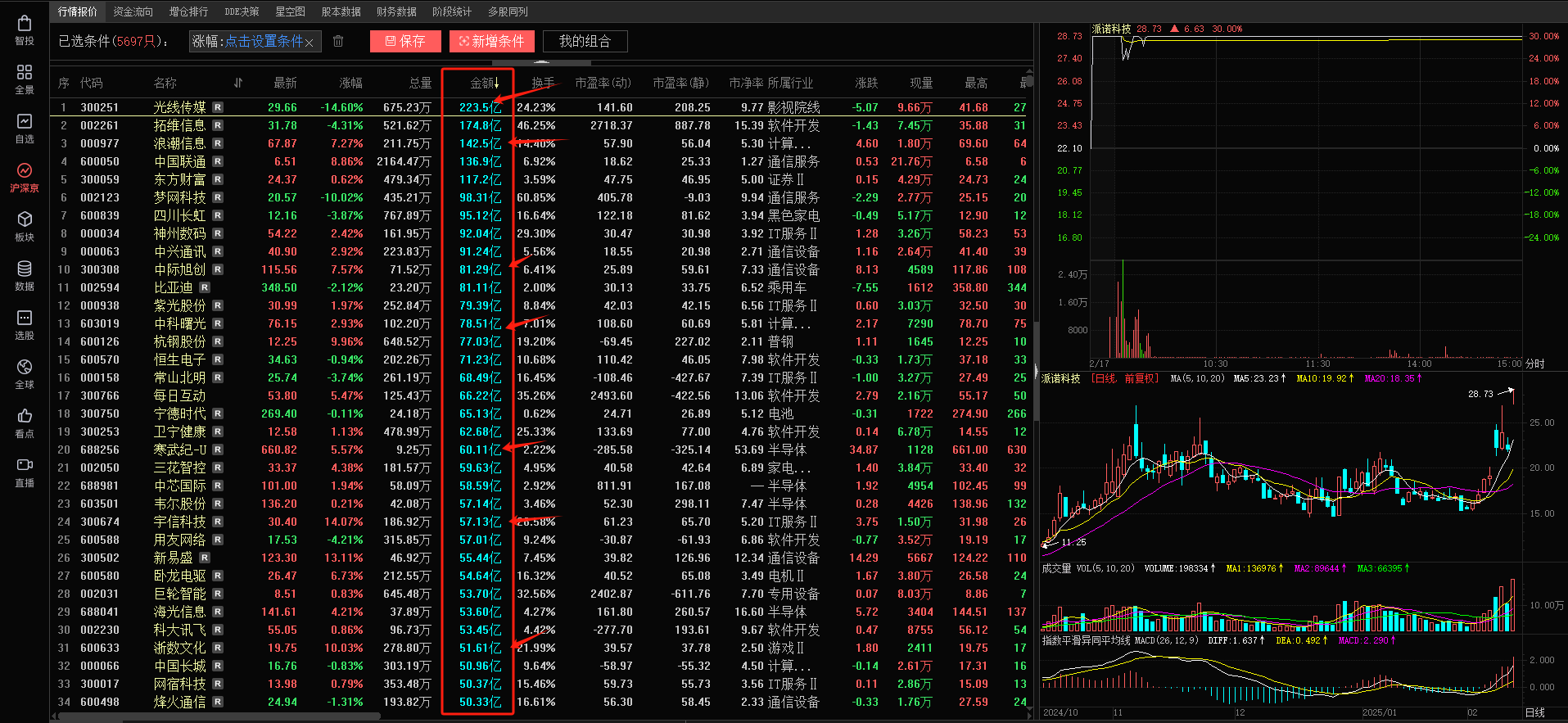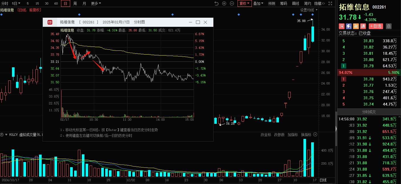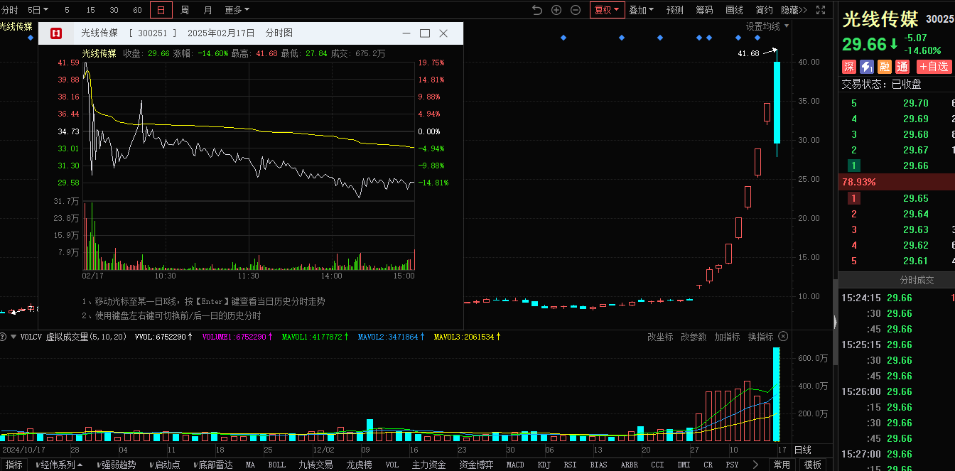 开盘之后,市场整体的成交量往下开始掉,高位的光线传媒从秒板直接跌到跌停附近,市场高位的情绪巨震,同时拓维信息这种也是开盘爆量之后往下探,同时前期一直加速的梦网科技直接往下走,整体的情绪瞬间往下反转退潮