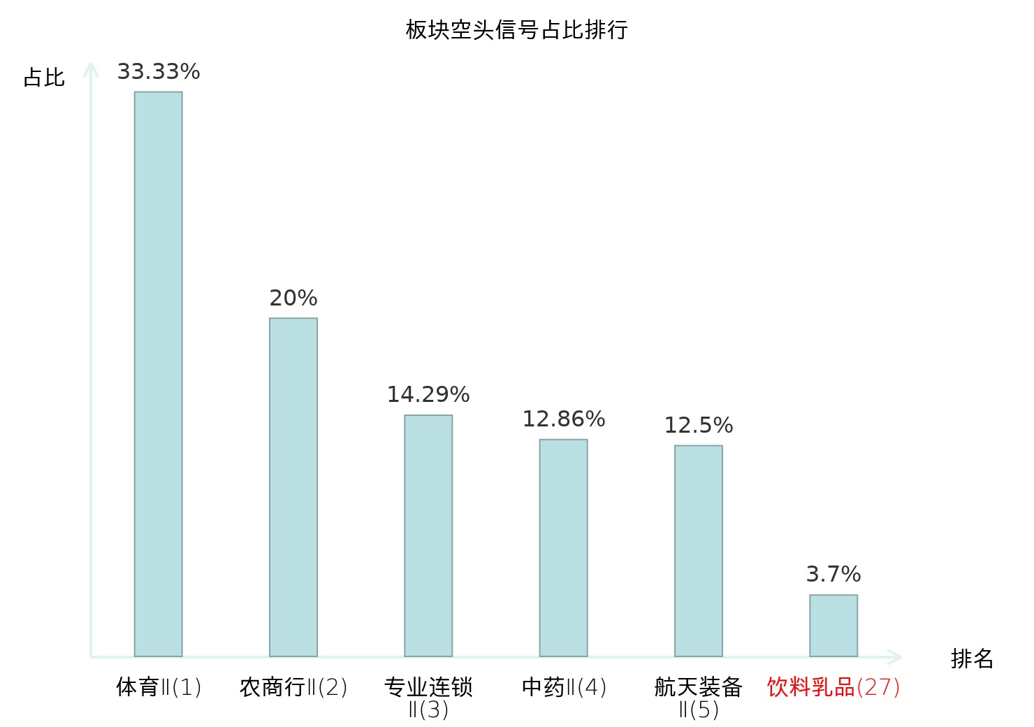 全市场所有行业板块中主力空头信号占比排名中,体育Ⅱ板块位居第一。医药商业板块名次提升最快,较昨日上升107位。
