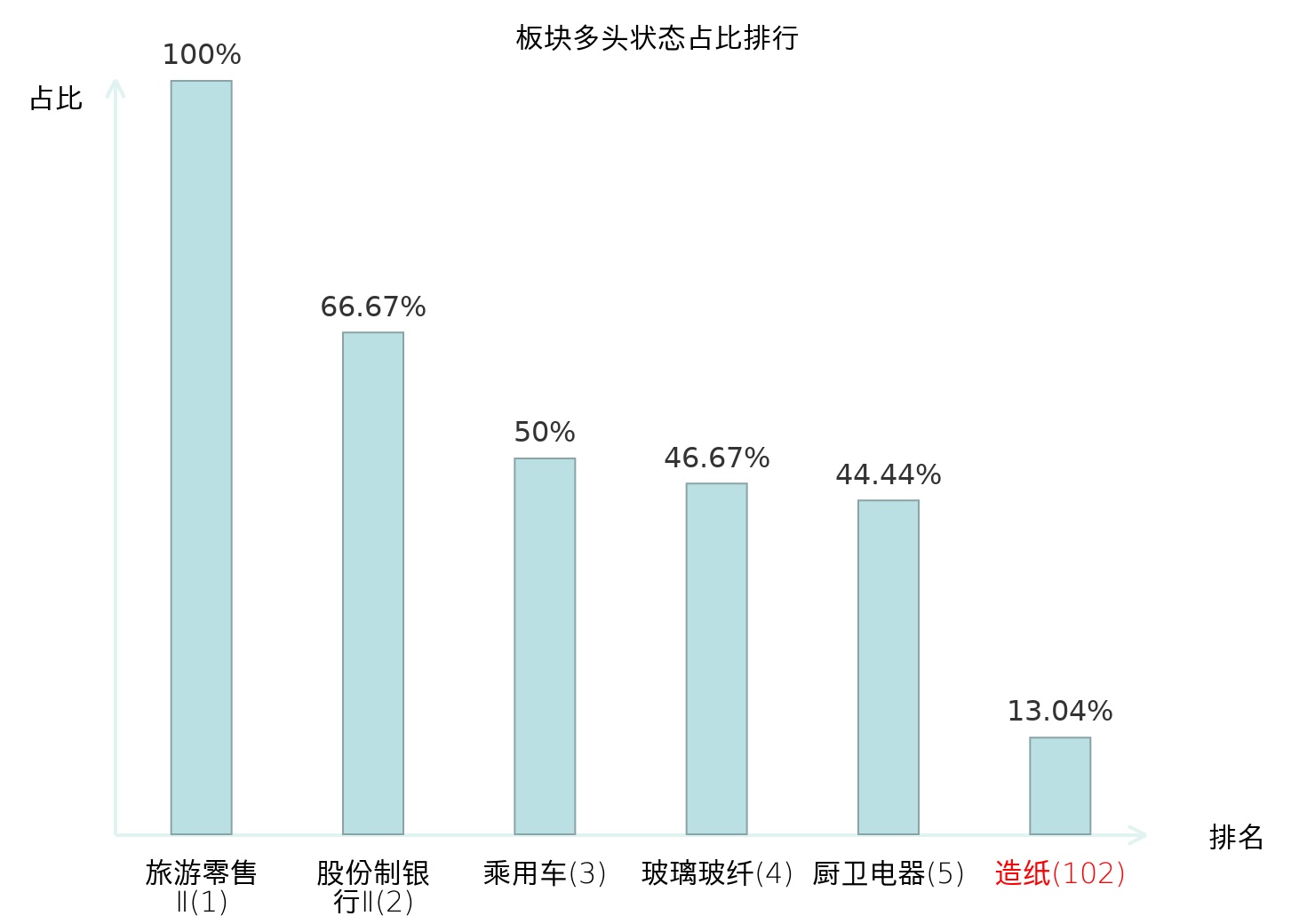 全市场所有行业板块中主力多头状态占比排名中,旅游零售Ⅱ板块位居第一。农产品加工板块名次提升最快,较昨日上升72位。