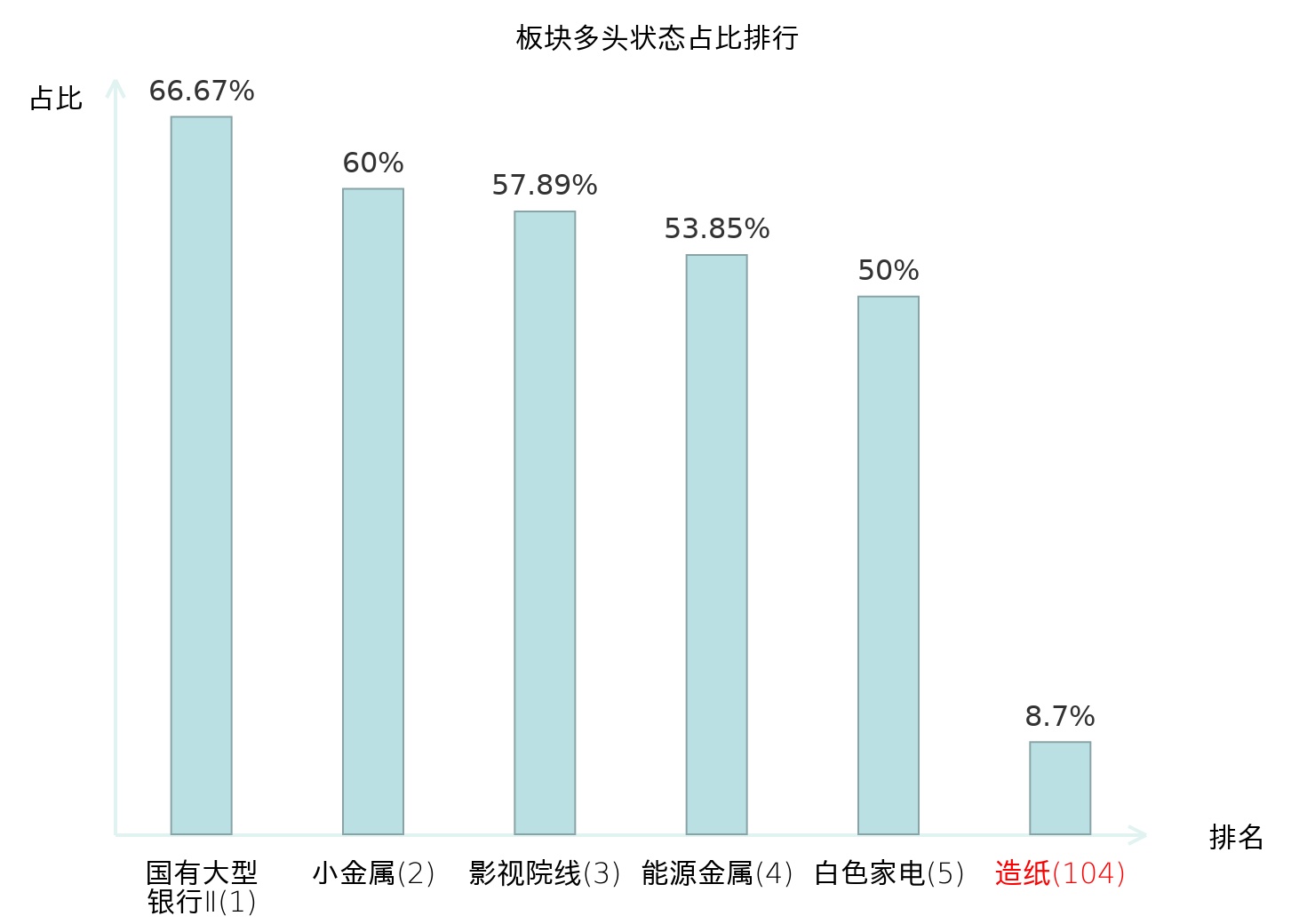 全市场所有行业板块中主力多头状态占比排名中,国有大型银行Ⅱ板块位居第一。装修装饰Ⅱ板块名次提升最快,较昨日上升48位。