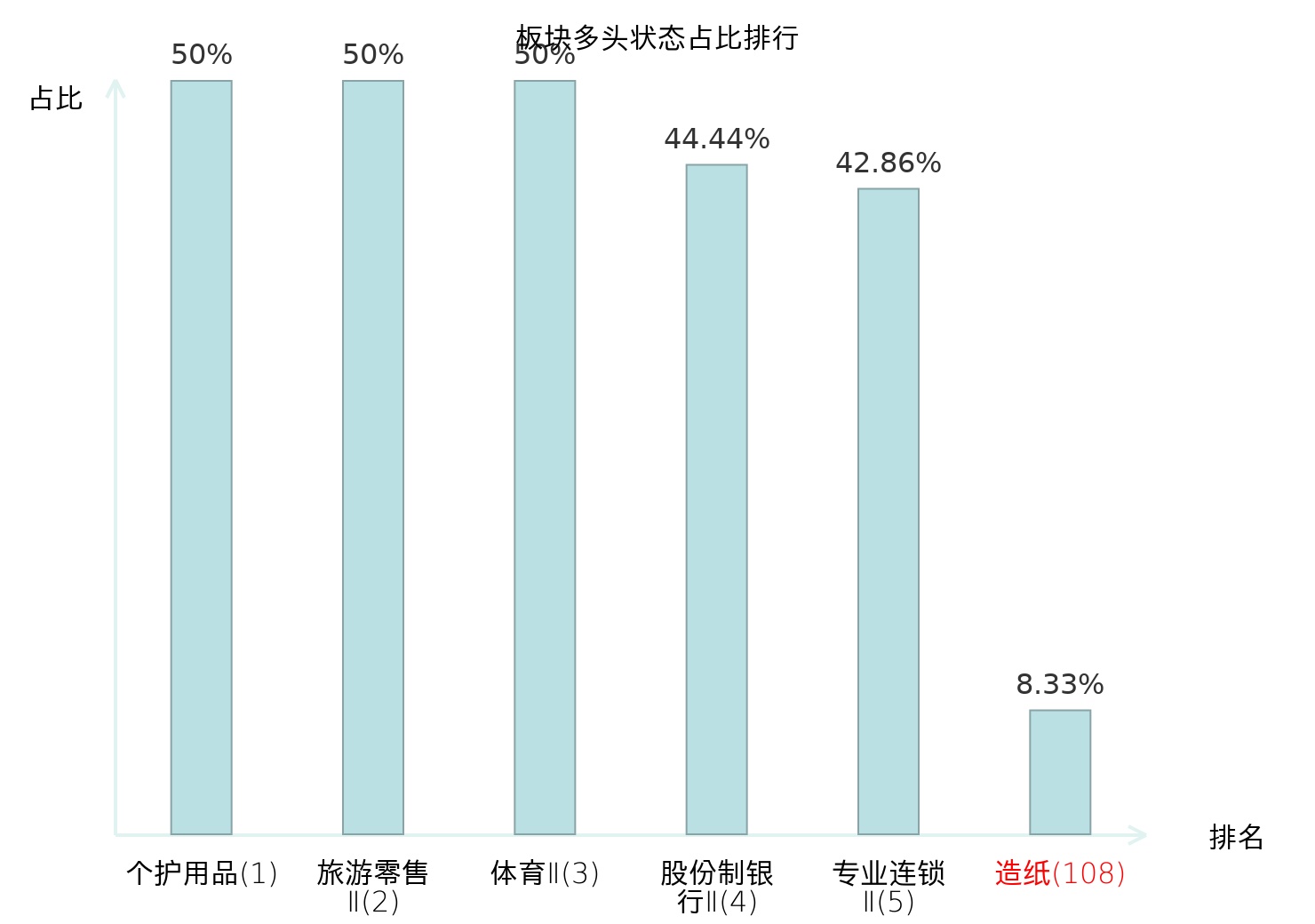 全市场所有行业板块中主力多头状态占比排名中,个护用品板块位居第一。非金属材料Ⅱ板块名次提升最快,较昨日上升37位。