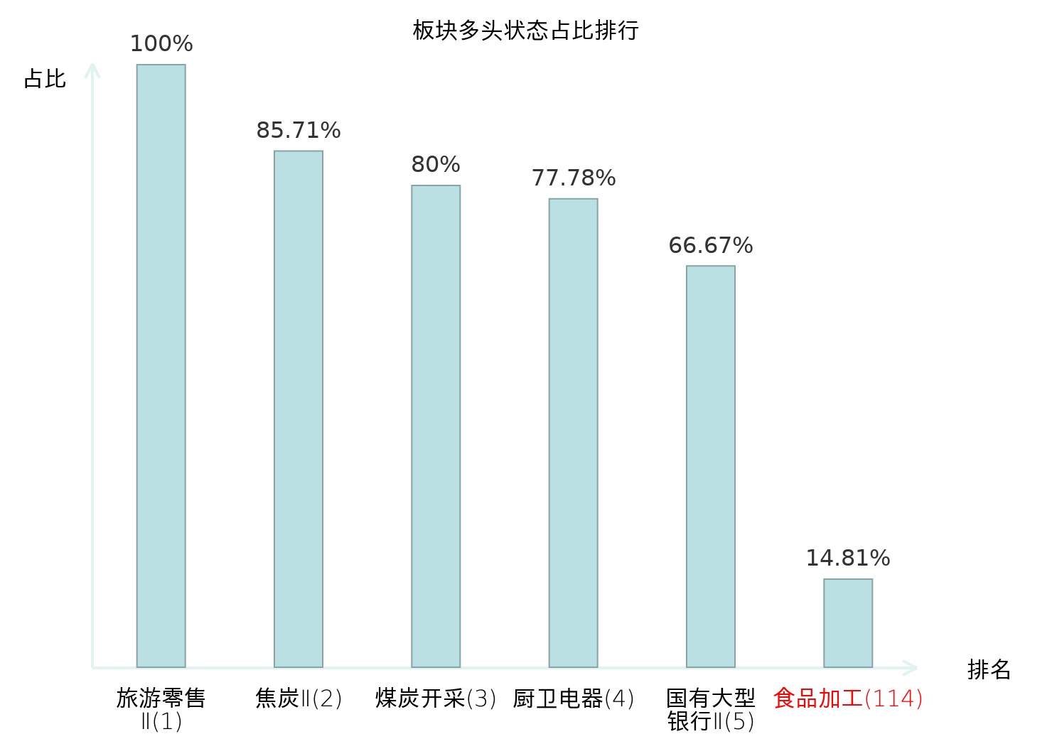 全市场所有行业板块中主力多头状态占比排名中,旅游零售Ⅱ板块位居第一。渔业板块名次提升最快,较昨日上升66位。