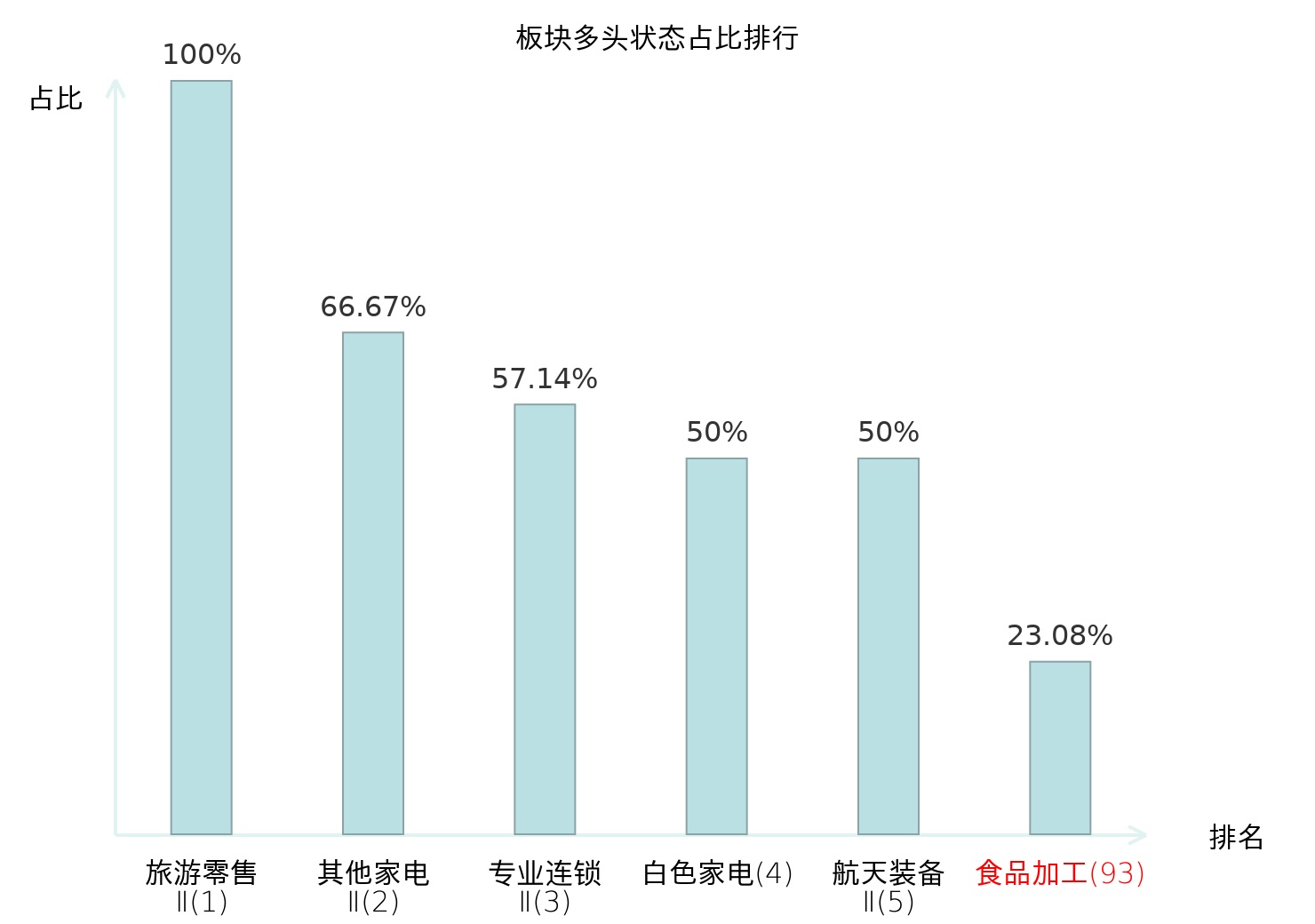 全市场所有行业板块中主力多头状态占比排名中,旅游零售Ⅱ板块位居第一。股份制银行Ⅱ板块名次提升最快,较昨日上升79位。