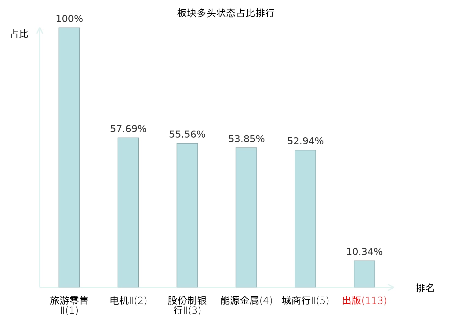 全市场所有行业板块中主力多头状态占比排名中,旅游零售Ⅱ板块位居第一。地面兵装Ⅱ板块名次提升最快,较昨日上升99位。