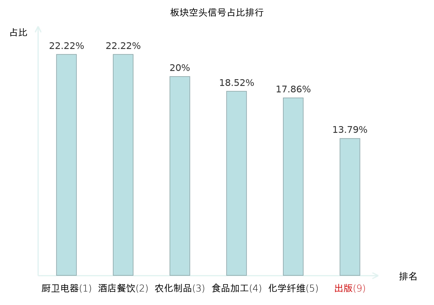 全市场所有行业板块中主力空头信号占比排名中,厨卫电器板块位居第一。化学纤维板块名次提升最快,较昨日上升119位。