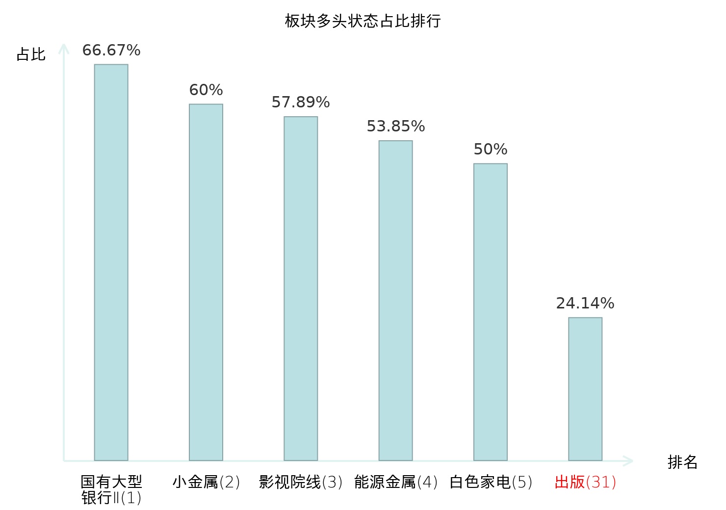 全市场所有行业板块中主力多头状态占比排名中,国有大型银行Ⅱ板块位居第一。装修装饰Ⅱ板块名次提升最快,较昨日上升48位。