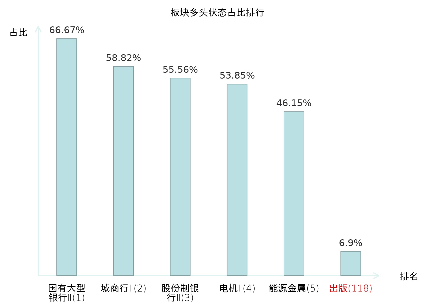 全市场所有行业板块中主力多头状态占比排名中,国有大型银行Ⅱ板块位居第一。自动化设备板块名次提升最快,较昨日上升57位。