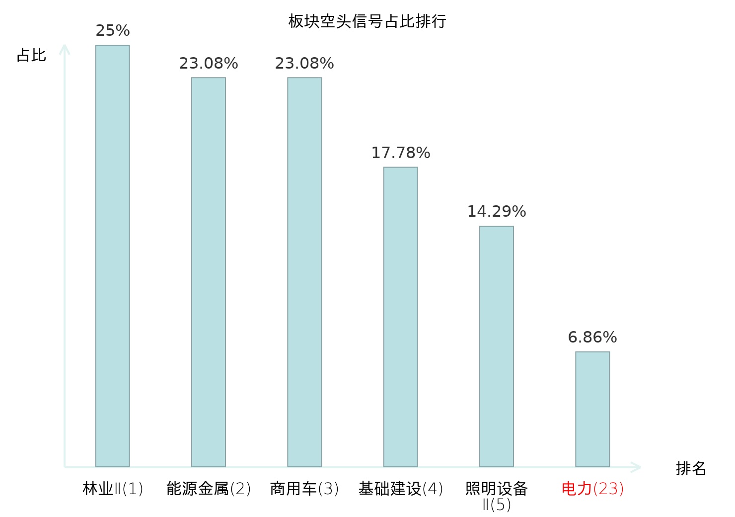 全市场所有行业板块中主力空头信号占比排名中,林业Ⅱ板块位居第一。油服工程板块名次提升最快,较昨日上升93位。