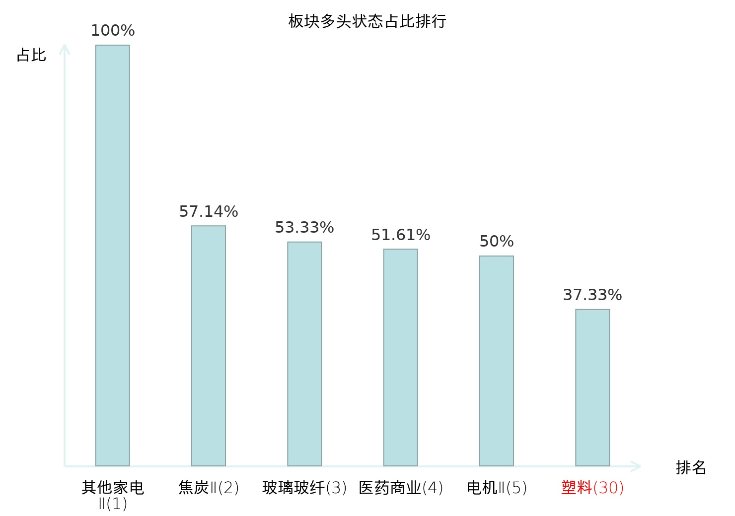 全市场所有行业板块中主力多头状态占比排名中,其他家电Ⅱ板块位居第一。白色家电板块名次提升最快,较昨日上升67位。