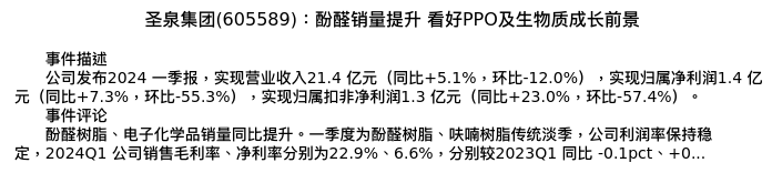 值得注意的是:2024年05月长江证券的马太/王明分析师,首次发布关于圣泉集团的研究报告,标题为:圣泉集团(605589):酚醛销量提升 看好PPO及生物质成长前景。