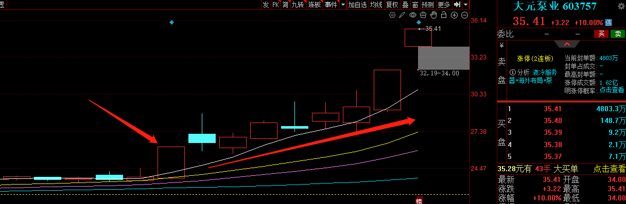 同样的逻辑,大元泵业也是涨停的突破板,技术面确认启动,