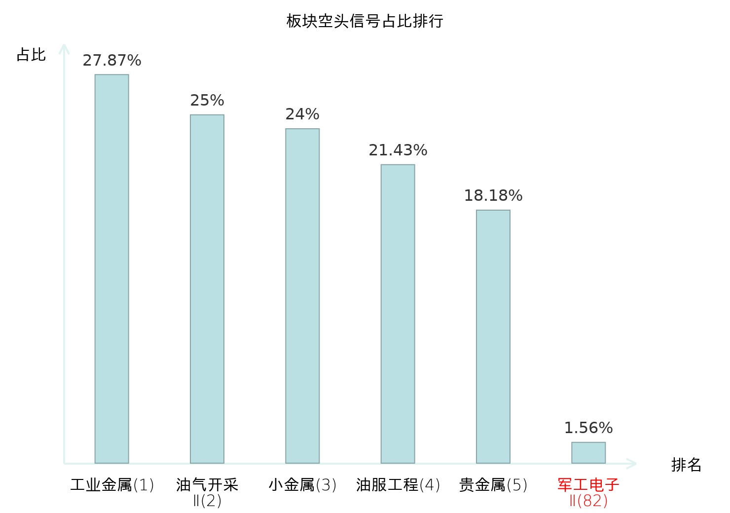 全市场所有行业板块中主力空头信号占比排名中,工业金属板块位居第一。饲料板块名次提升最快,较昨日上升112位。