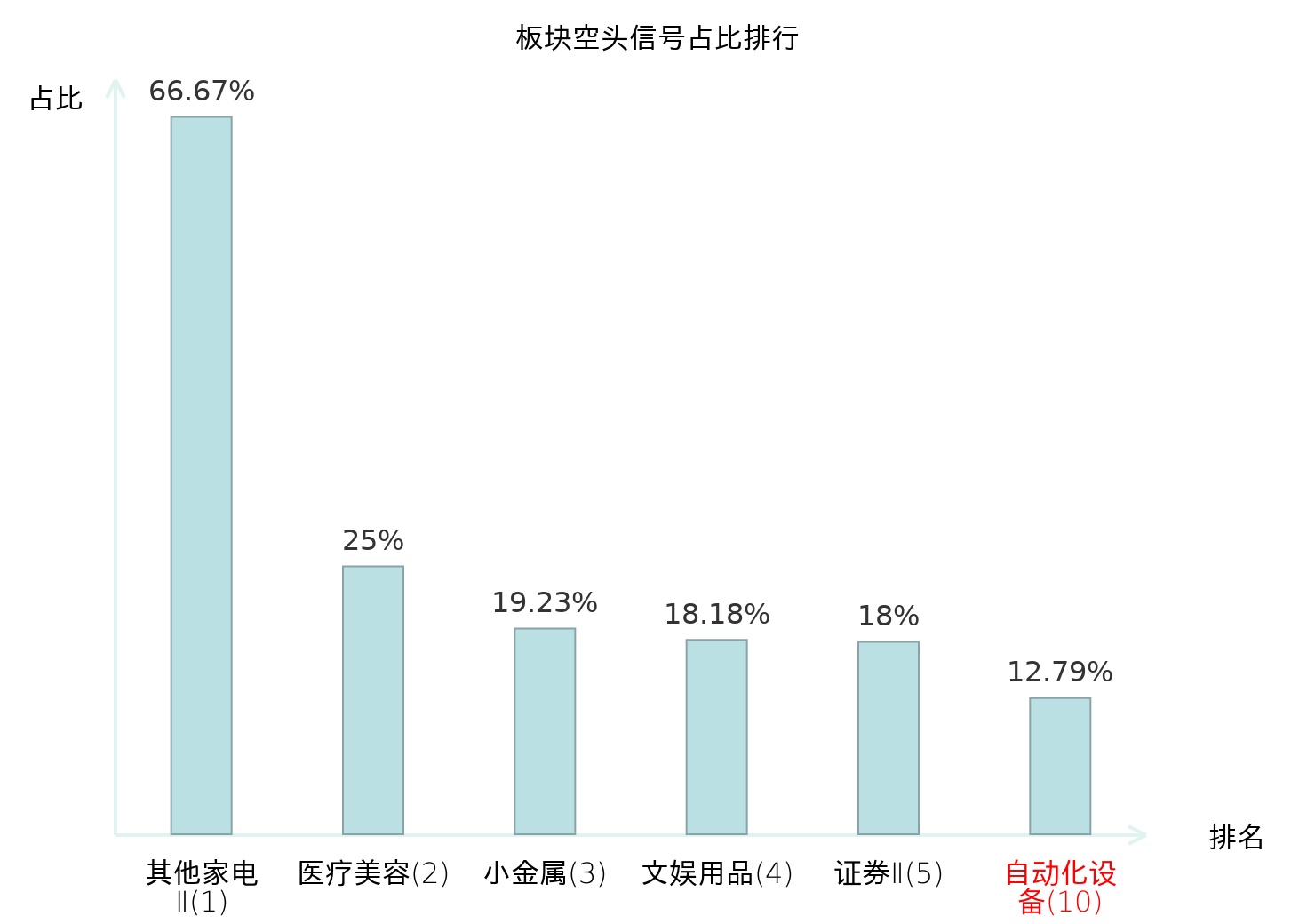 全市场所有行业板块中主力空头信号占比排名中,其他家电Ⅱ板块位居第一。证券Ⅱ板块名次提升最快,较昨日上升108位。