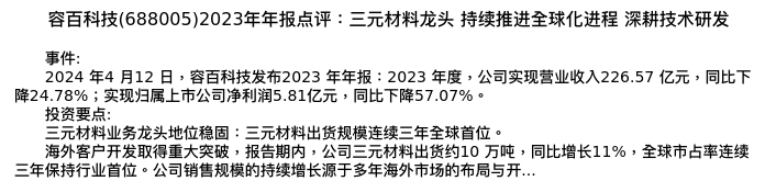 值得注意的是:2024年04月国海证券的李航分析师,首次发布关于容百科技的研究报告,标题为:容百科技(688005)2023年年报点评:三元材料龙头 持续推进全球化进程 深耕技术研发。