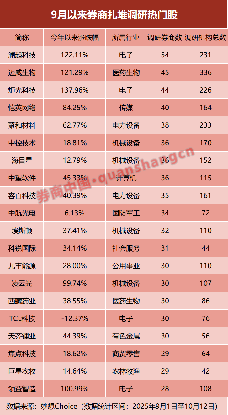 妙想Choice数据显示,9月以来,券商合计调研了超880家上市公司,主要集中在机械设备、电子、医药生物、电力设备、基础化工、计算机等行业。