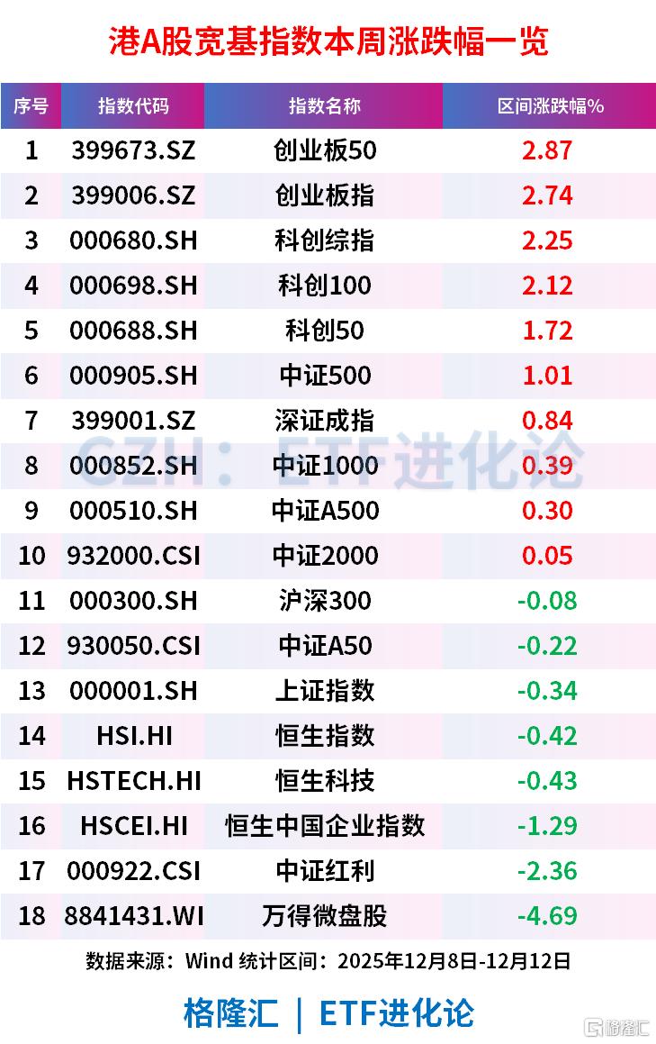 周度维度来看,成长风格指数表现更亮眼,创业板50、创业板指、科创综指和科创100本周均涨超2%,中证A500微涨0.3%,沪深300微跌0.08%。中证红利指数走弱,跌2.36%。港股继续走弱,恒生指数、恒生科技指数均跌0.4%。