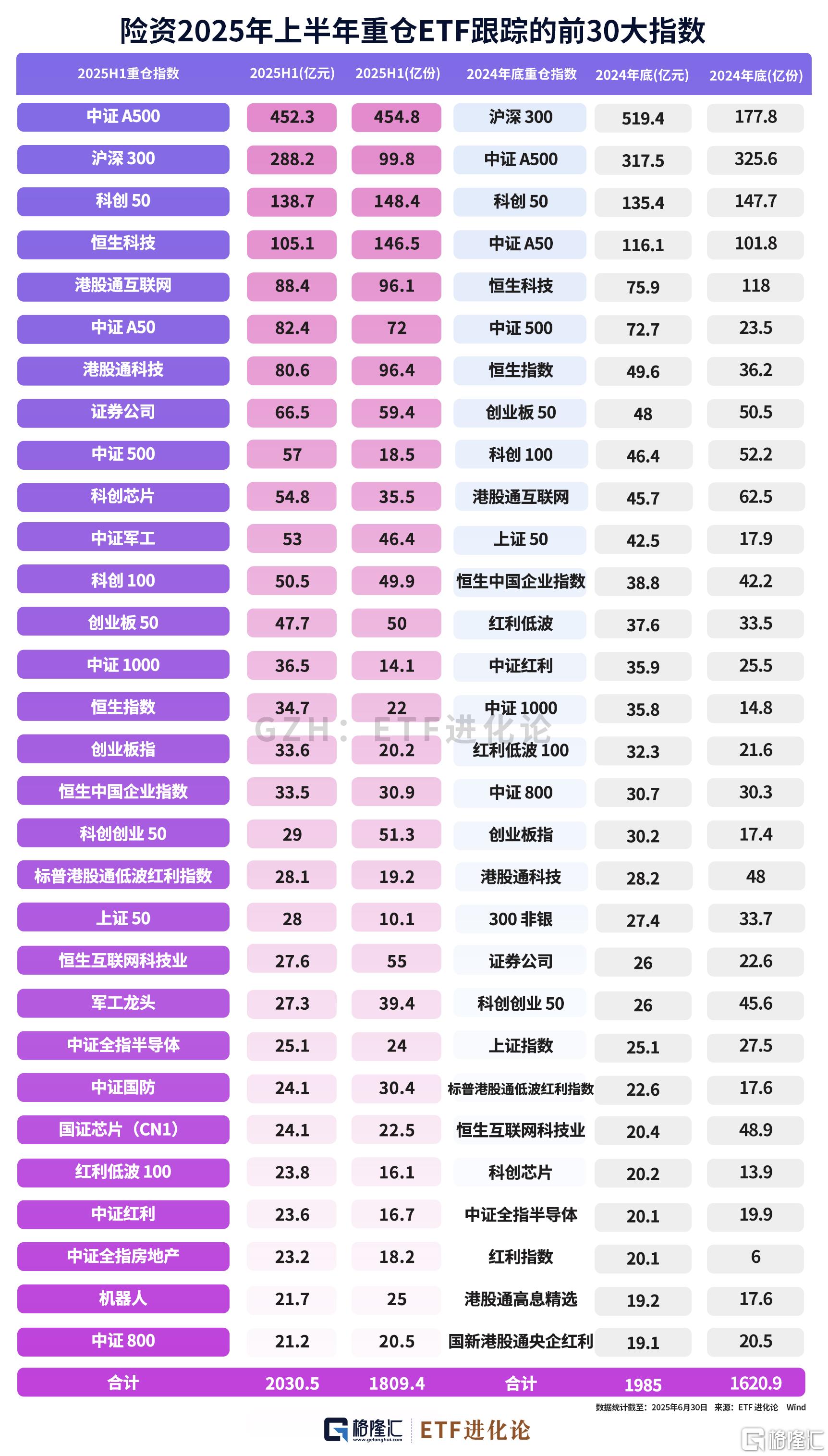 A500指数作为新国九条发布后的首个核心宽基指数,自发布后迅速获得市场认可,截至2024年底已成为A股第二大宽基指数(仅次于沪深300),ETF产品规模突破2000亿元,成为A股历史上规模增长最快的指数,今年上半年更是一举成为险资最青睐的宽基指数,上半年持有的中证A500指数合计规模高达452亿元,超过沪深300的288.2亿元。