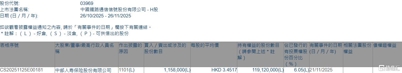 中国通号(03969.HK)获中邮人寿保险增持115.8万股