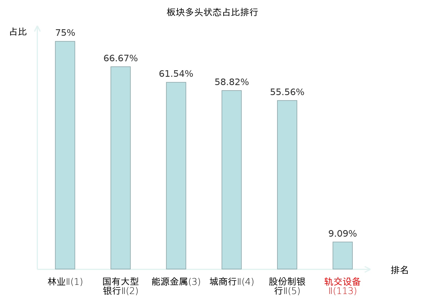 全市场所有行业板块中主力多头状态占比排名中,林业Ⅱ板块位居第一。专业连锁Ⅱ板块名次提升最快,较昨日上升63位。
