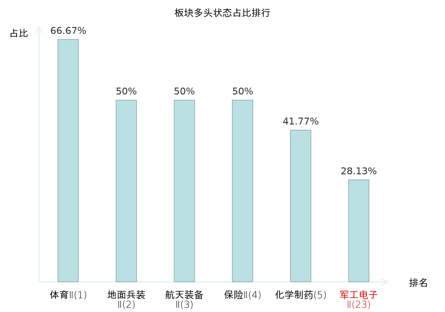 全市场所有行业板块中主力多头状态占比排名中,体育Ⅱ板块位居第一。普钢板块名次提升最快,较昨日上升98位。