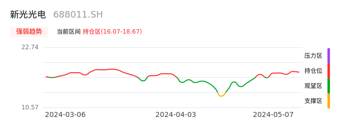 我们来看一下该股的九方特色指标强弱趋势的情况:新光光电自04月26日从观望区上穿到持仓区。股价近期在多头区域回调整理。后续重点关注多空分界点的争夺:16.07元。如未能有效站稳则可能重新回到空头行情。