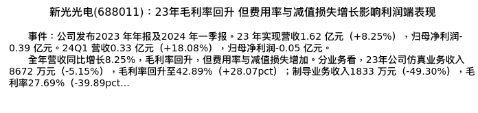 值得注意的是:2024年05月东方证券的王天一/罗楠/冯函分析师,首次发布关于新光光电的研究报告,标题为:新光光电(688011):23年毛利率回升 但费用率与减值损失增长影响利润端表现。