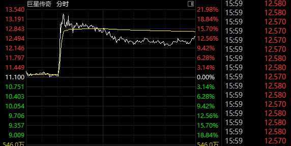 “周杰伦概念股”巨星传奇盘中大幅飙升,一度涨超20%,截至收盘,仍涨约13%,市值超110亿港元。