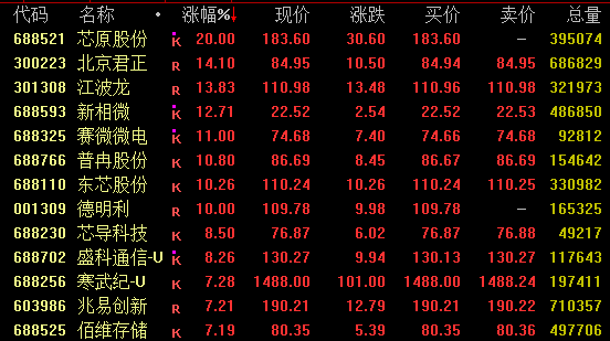 半导体板块盘中走势活跃,截至收盘,芯原股份20%涨停,北京君正、江波龙涨约14%,德明利亦涨停;寒武纪涨超7%,盘中一度涨近10%,重返1500元上方。