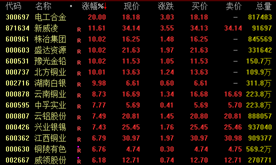 有色板块盘中强势拉升,截至收盘,电工合金20%涨停,新威凌涨近12%,盛达资源、豫光金铅、北方铜业、湖南白银等涨停,云南铜业涨近9%。