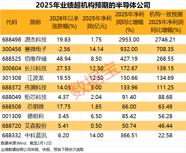赛微电子2025年业绩大幅扭亏,净利润同比增幅超过930%,远超机构一致预测的净利润增幅;德明利2025年净利润同比增幅下限超过85%,较机构一致预测的2025年净利润同比增幅高出29个百分点以上。