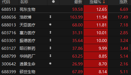 上证报中国证券网讯 9月12日午后,医药生物板块拉升回暖。截至13时23分,塞力医疗、振德医疗、昭衍新药涨停。苑东生物涨超12%,浩欧博、天臣医疗涨逾11%。