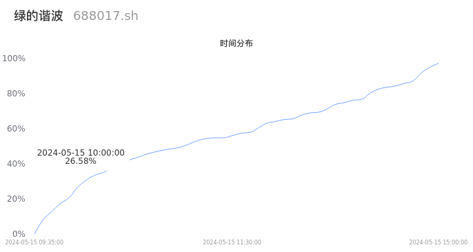 688017绿的谐波2024年05月15日成交8845手,成交金额9750.24万元,相较昨日缩量7890手,换手率0.52%,成交清淡。