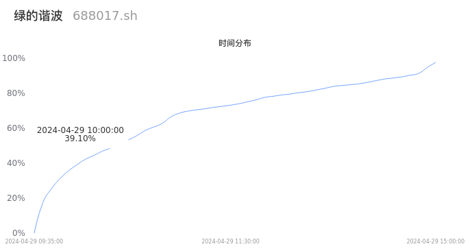 688017绿的谐波2024年04月29日成交2.66万手,成交金额3.26亿元,相较昨日放量5847手,换手率1.58%,成交清淡。