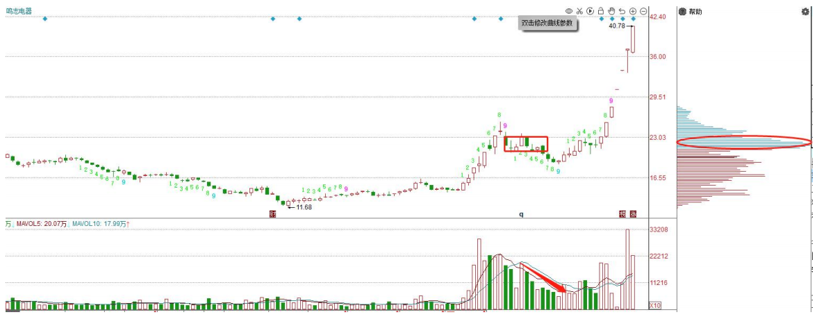 如图,鸣志电器在方框部分调整过程中形成了 22-23 元的密集峰,随后股价下跌击穿密集峰区域。看下图: