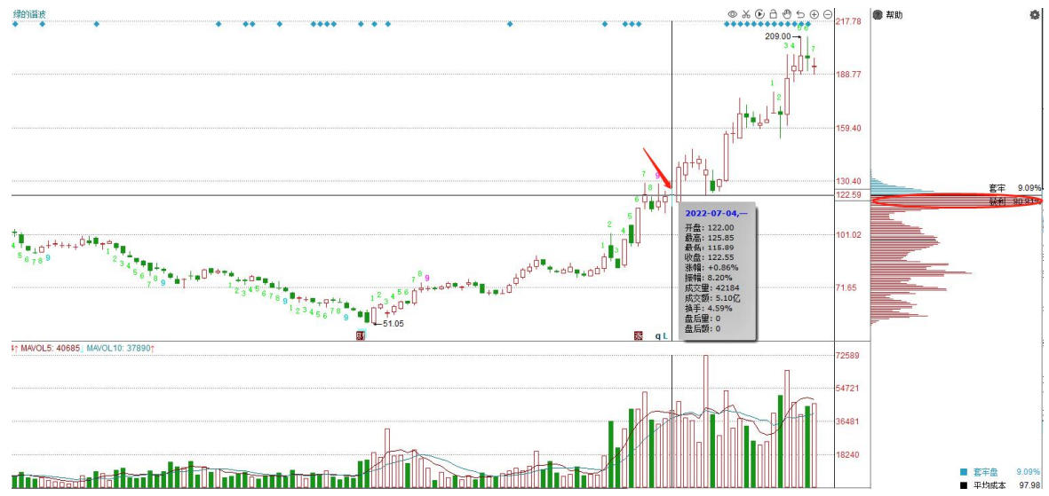 在上图中,绿的谐波在 2022 年 7 月 4 日箭头处的股价形成的密集单峰位置在 120 元附近,随后中阳线拉升形成突破,继续看下图:
