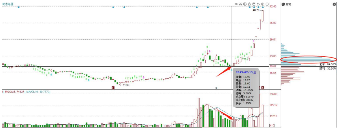 如图,鸣志电器在方框部分调整过程中形成了 22-23 元的密集峰,随后股价下跌击穿密集峰区域。看下图: