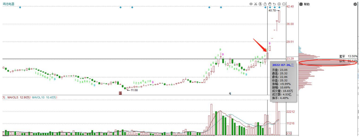上图,股价在7月26日放量突破该密集峰区域,确立单峰突破形态,短线行情爆发,后期则是连续涨停。