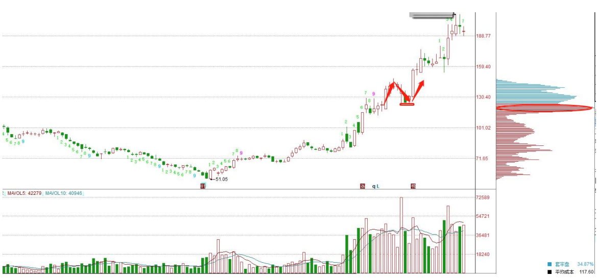 操盘要点:洗盘回调后回升至原单密集峰处,然后放量突破原单密集峰。这是较 好的介入时机。