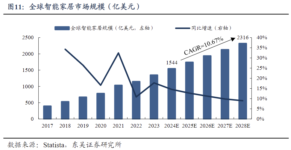 智能家居市场稳健发展,有望支撑乐鑫业务继续增长。全球智能家居市场规模和出货量继续增长,产品均价呈下降趋势。据PrecedenceResearch预测,2025年全球智能家居市场收入将达到1544亿美元,2024-2028年复合增长率达10.67%。