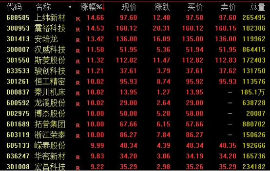 机器人概念午后发力走高,截至收盘,上纬新材涨近15%,盘中一度涨停;震裕科技涨超14%,盘中续创新高;安培龙涨超13%,亦创出新高;汉威科技、斯菱股份、骏创科技等涨超10%。