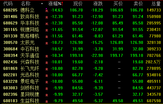 CPO等AI产业链股今日大幅回调,截至收盘,锐捷网络、太辰光、天孚通信等跌超10%,光迅科技、景旺电子、剑桥科技等跌停,新易盛跌近8%。