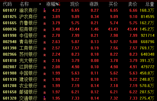 银行板块今日逆市上扬,截至收盘,渝农商行涨超4%,沪农商行、齐鲁银行、招商银行等涨超3%。