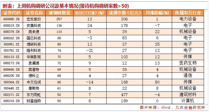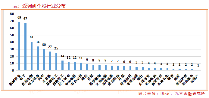 从行业分布来看,本周机械设备、电子行业,均有超60家上市公司接受调研,居前;随后为医药生物行业,有超40家上市公司接受调研。