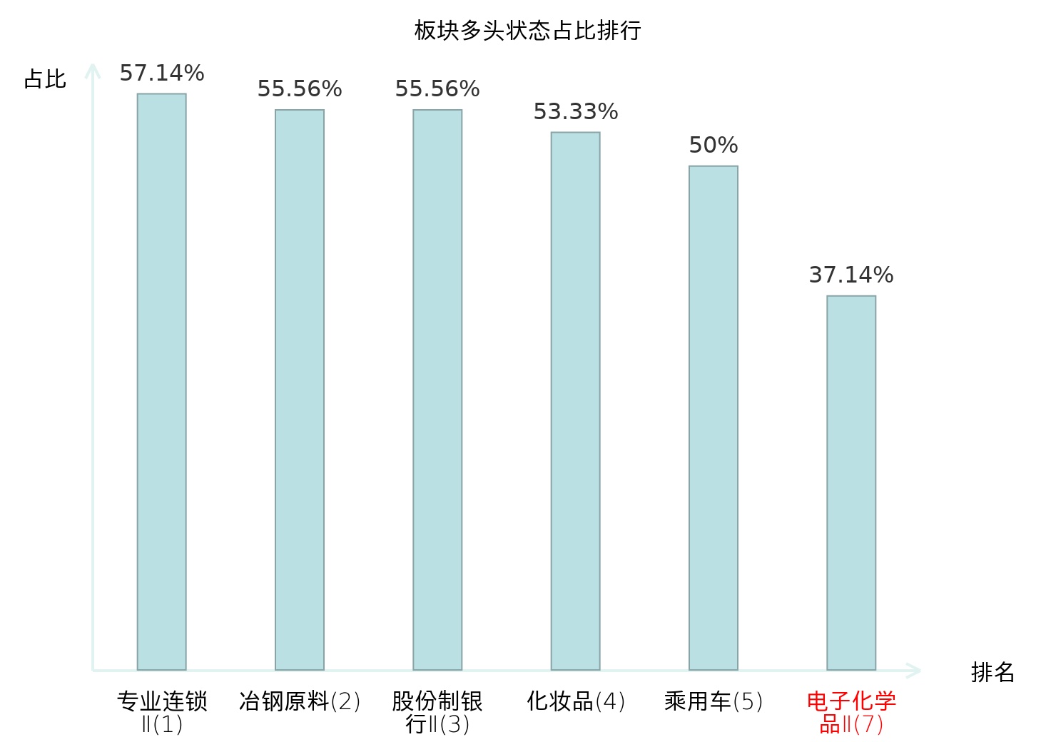 全市场所有行业板块中主力多头状态占比排名中,专业连锁Ⅱ板块位居第一。房地产服务板块名次提升最快,较昨日上升52位。