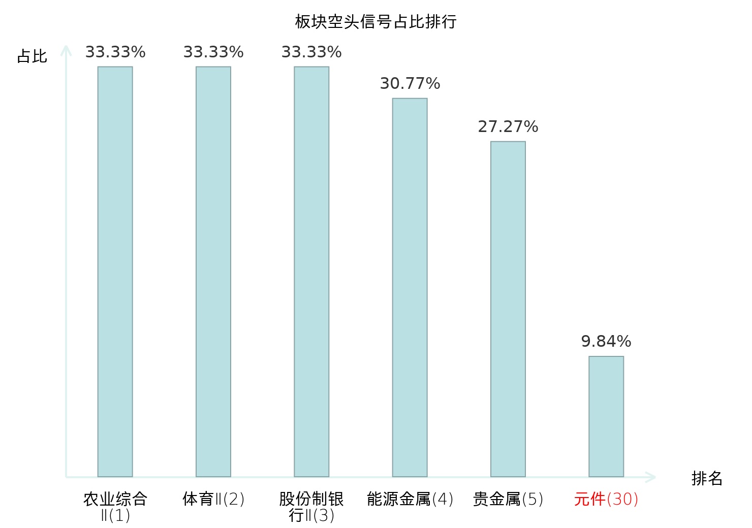 全市场所有行业板块中主力空头信号占比排名中,农业综合Ⅱ板块位居第一。出版板块名次提升最快,较昨日上升115位。