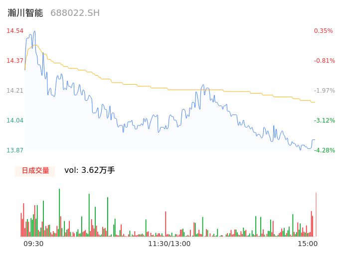 04月12日,瀚川智能收报13.93,股价涨幅-3.86%,成交金额5120.64万元,换手率2.06%。